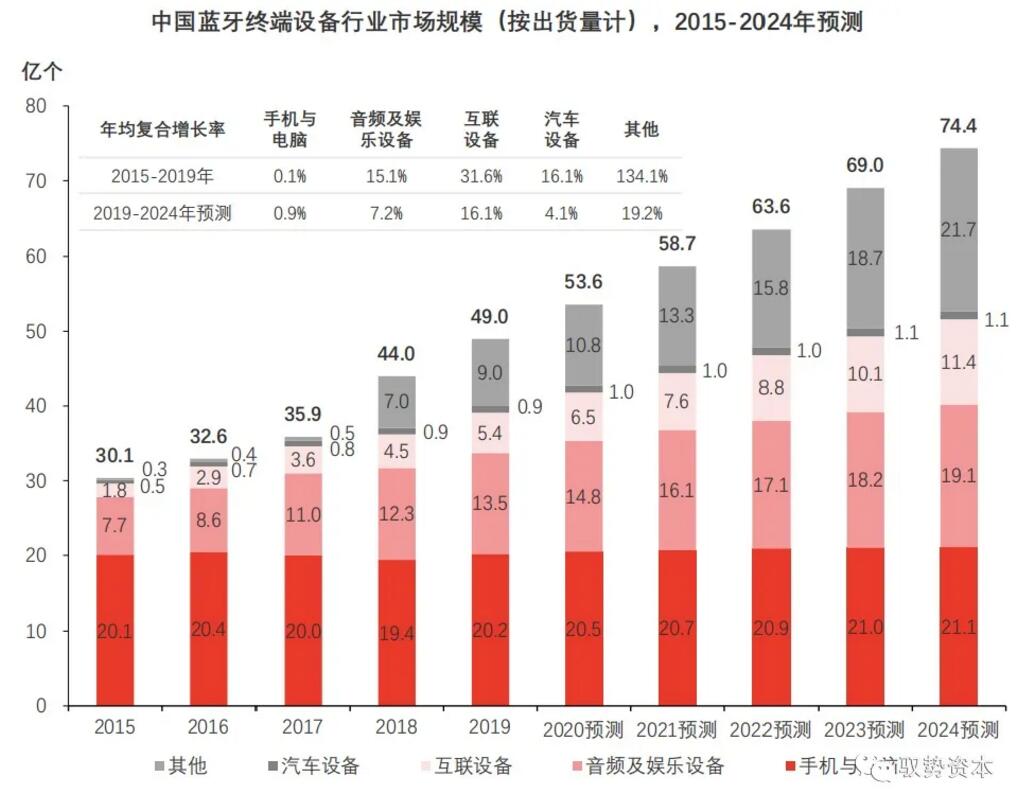 2015年至2020年期間中國藍牙終端設備出貨量穩步提升,未來伴隨藍牙芯片在各領域滲透率持續提升,預計至2024年藍牙終端設備出貨量將達74.4億個。