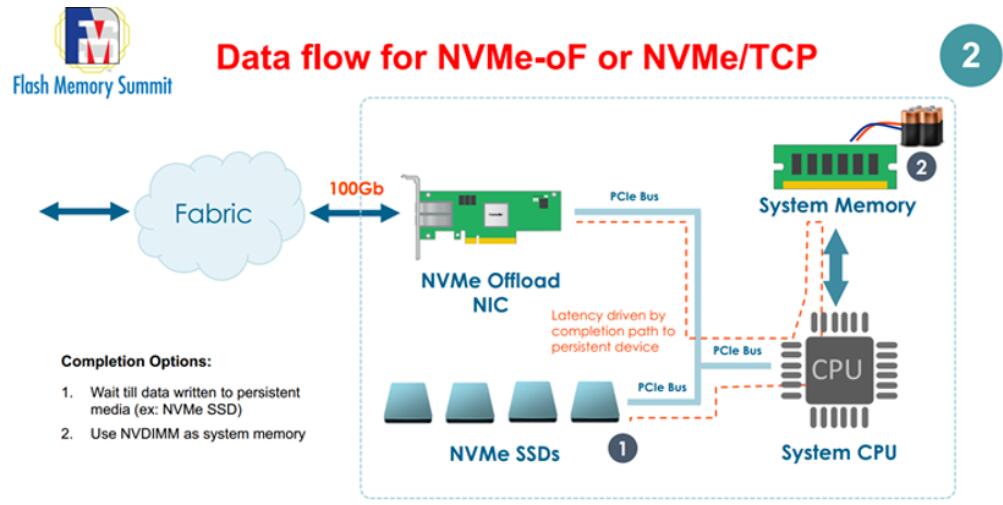 以下圖片是傳統(tǒng)的NVMe-oF的數(shù)據(jù)流,要通過(guò)系統(tǒng)內(nèi)存和CPU再進(jìn)入NVMe SSD,這樣會(huì)導(dǎo)致讀寫(xiě)延遲比較長(zhǎng)。