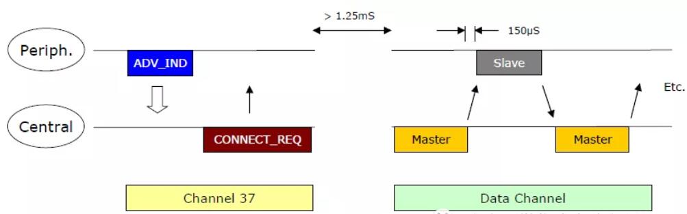 低功耗藍(lán)牙芯片特有的設(shè)計,也是其快速建立連接的基礎(chǔ)。低功耗藍(lán)牙設(shè)備之間建立連接的過程如下: