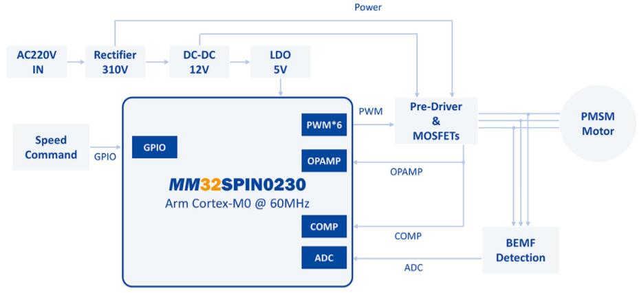 MM32SPIN0230為主控的低成本無(wú)刷高速吹風(fēng)機(jī)單片機(jī)方案。
